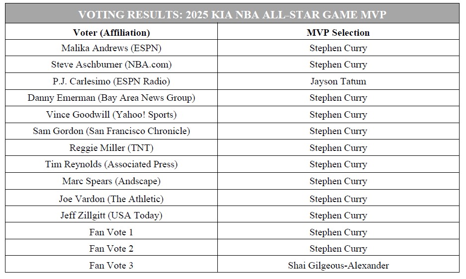 最后,库里赢得了14票中的12票,并以绝对优势当选为旧金山AMVP,赢得了科比杯,并在职业生涯中第二次当选为全明星MVP。